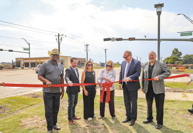 Commissioner Edmondson cuts the ribbon to activate the new traffic signal at the main entrance to Robson Ranch, flanked by County Judge Andy Eads, Mayors Hudspeth and Montini, Mayor Pro-Tem Maryl Lowrencz, and ESD #1 Board President Rettig.