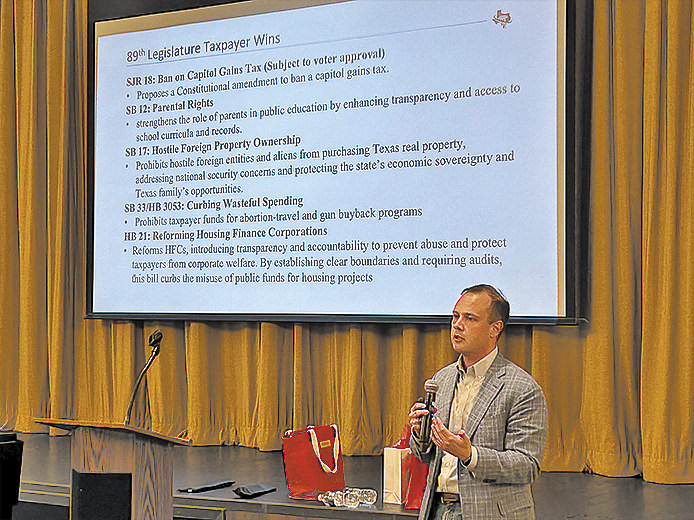 Mr. McVeigh’s presentation focused heavily on the 17 proposed constitutional amendments on the Tuesday, Nov. 4, ballot in an effort to apply the Texas Prosperity Plan principles outlined by TFR, which include ending taxpayer-funded lobbying, elimination of property taxes, and cutting government spending. Ending taxpayer-funded lobbying allows elected officials to represent constituents directly and fund essential services rather than lining lobbyists’ pockets. TFR proposes phasing out property taxes, starting with school taxes, which account for roughly half of the average property owner’s tax bill. Because Texas state spending has grown faster than population growth plus inflation, it has become unsustainable and makes property tax relief extremely difficult. TFR calls for capping the state budget and cutting wasteful spending to prioritize the needs of Texas families. Following the presentation, the audience engaged in a question-and-answer session.