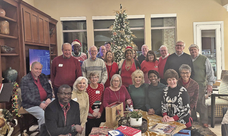 The beautifully decorated home of Kim and Jim Snyder was the site of Pilot Knob Rotary Club’s Christmas Party on Dec. 5. After enjoying a wonderful meal, the merriment continued with a lively gift exchange. Linda Bragg facilitated the gift exchange, and music was provided by Rotary members Wes Shipley, Mike Weaver, and Landon Taylor. As is our tradition with all social events, canned goods were collected for distribution to Denton Community Food Center. Current economic conditions are forcing more and more families to seek our help for food.