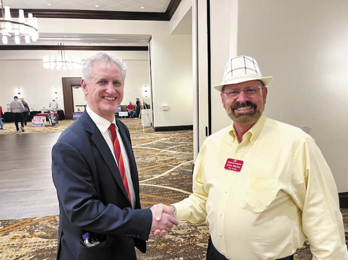 Tim McCormick shaking hands with Don Hicks (I) for Precinct Chair prior to the forum