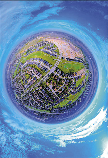North is up as Robson Boulevard continues. Tan areas are bare ground of new construction. A number of bare lots have already sold. The high cirrus clouds help frame this “asteroid” panoramic produced by a DJI Air 2S drone. (Photo by Dennis Brooks)